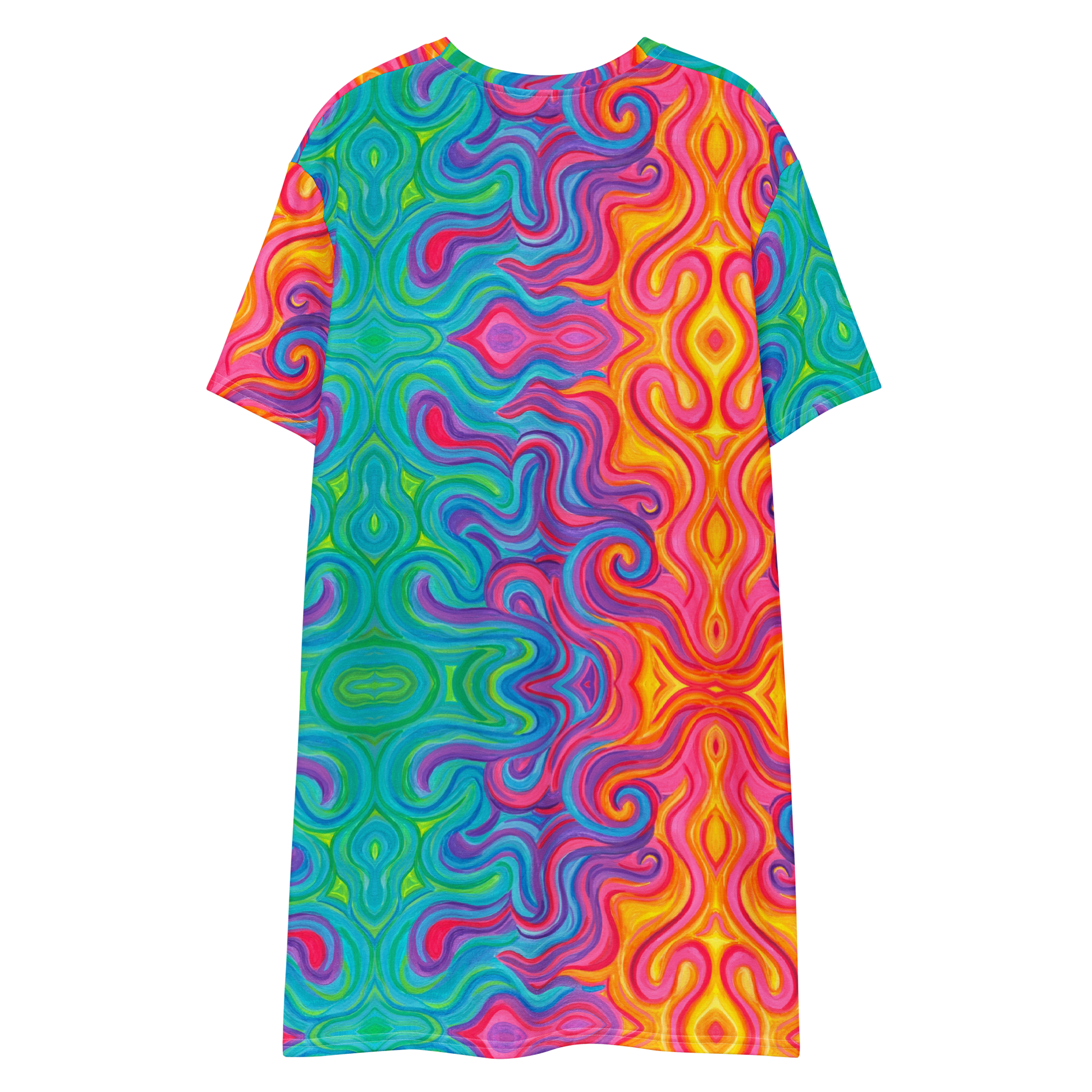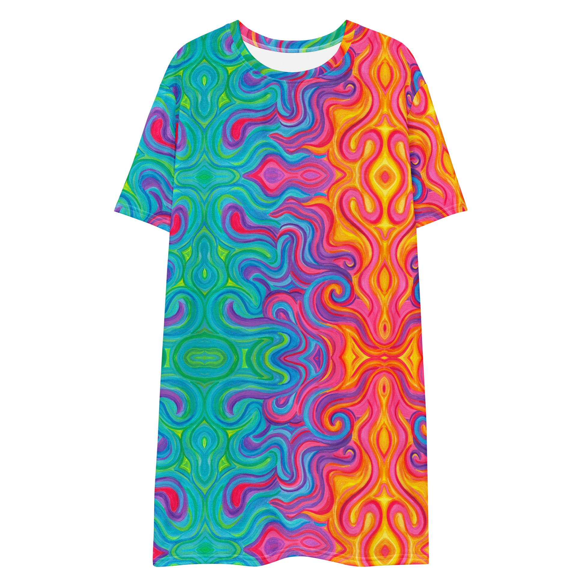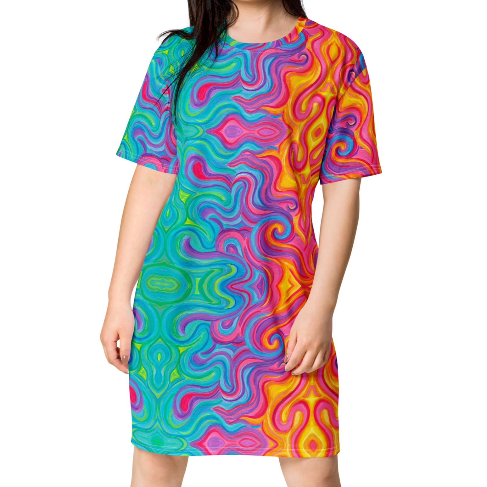 Soft, stretchy, oversized T-shirt dress with a lowered armhole, a widened sleeve, and a drop shoulder created in my hand-painted "Elemental" Design