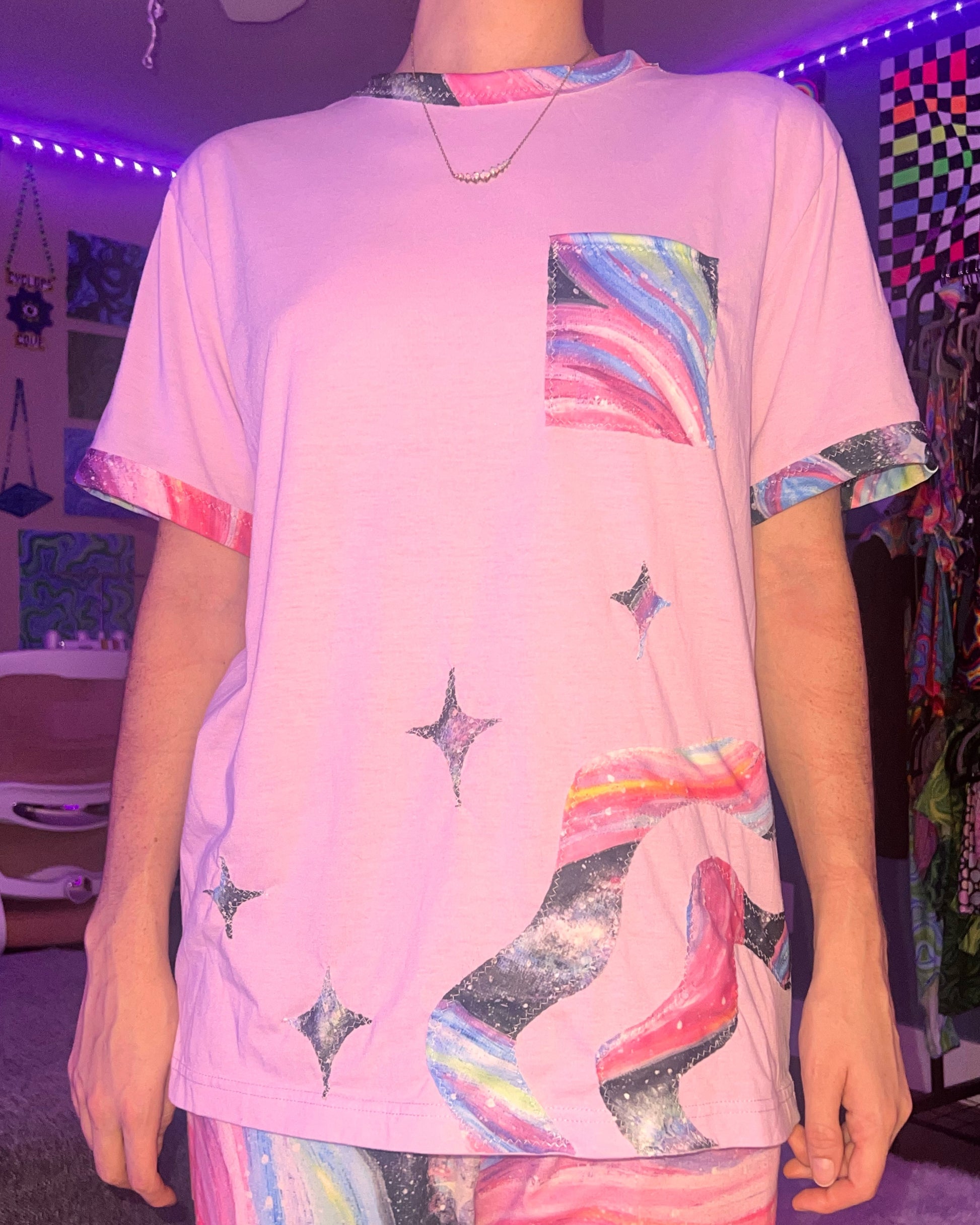 One of a kind soft light pink/purple up-cycled t-shirt with "Celestial" design fabric pieces sewn onto it